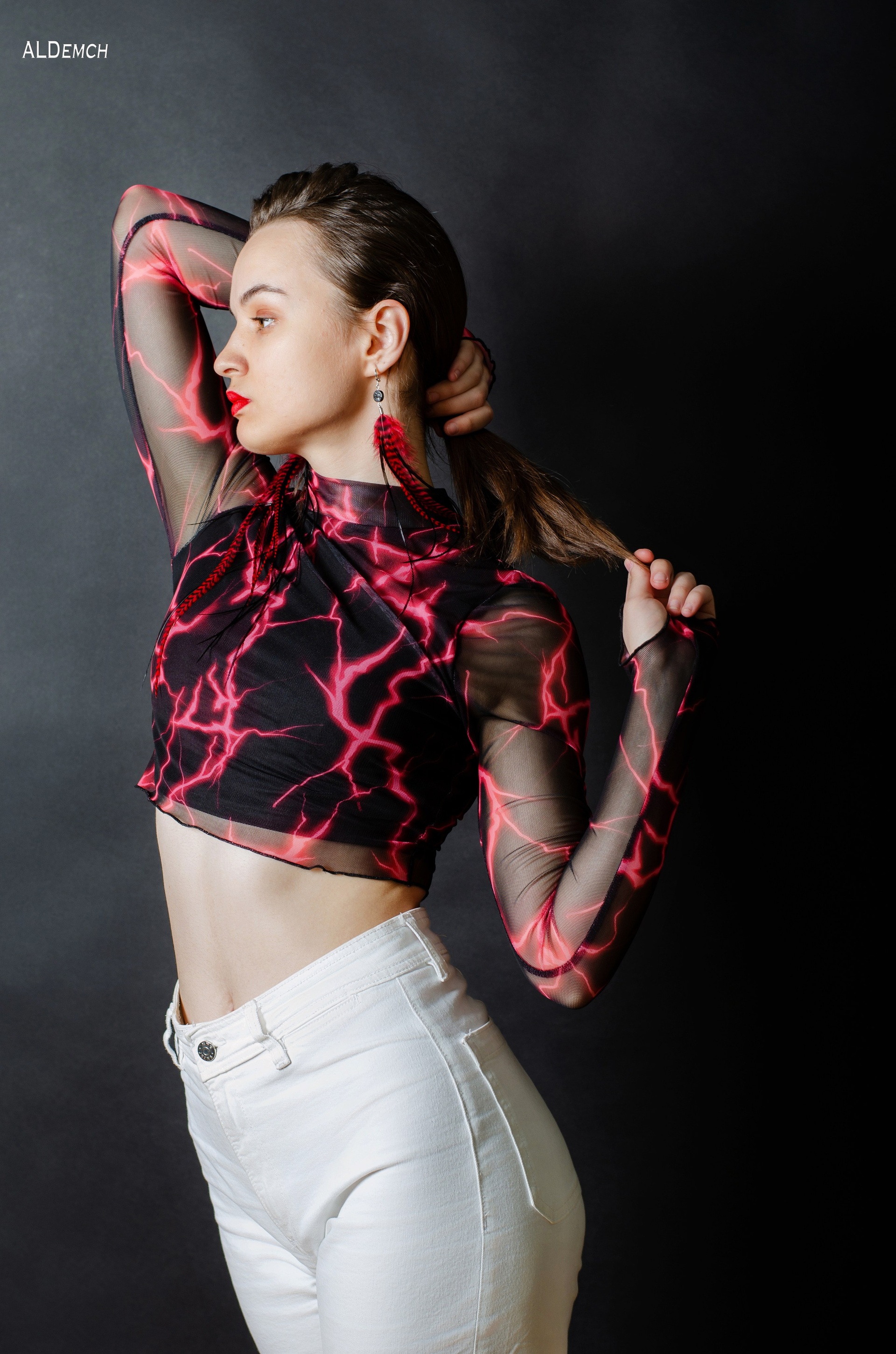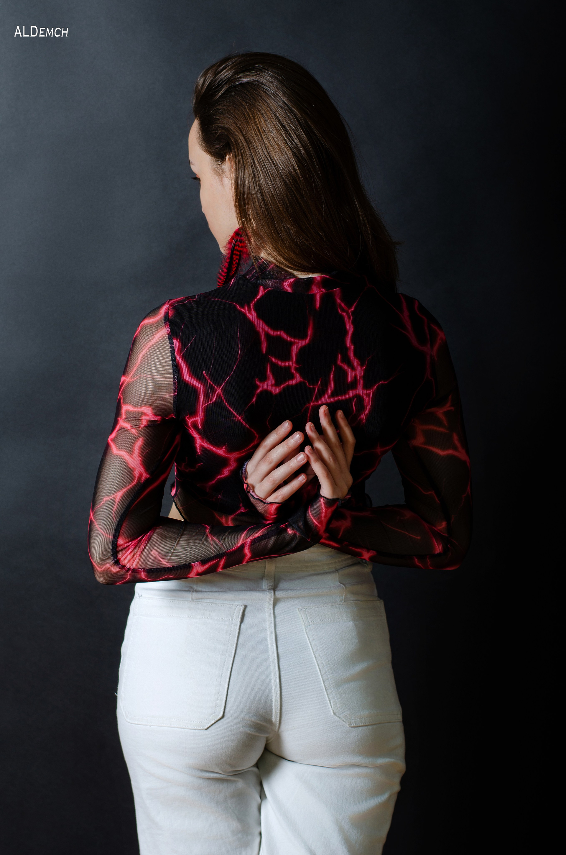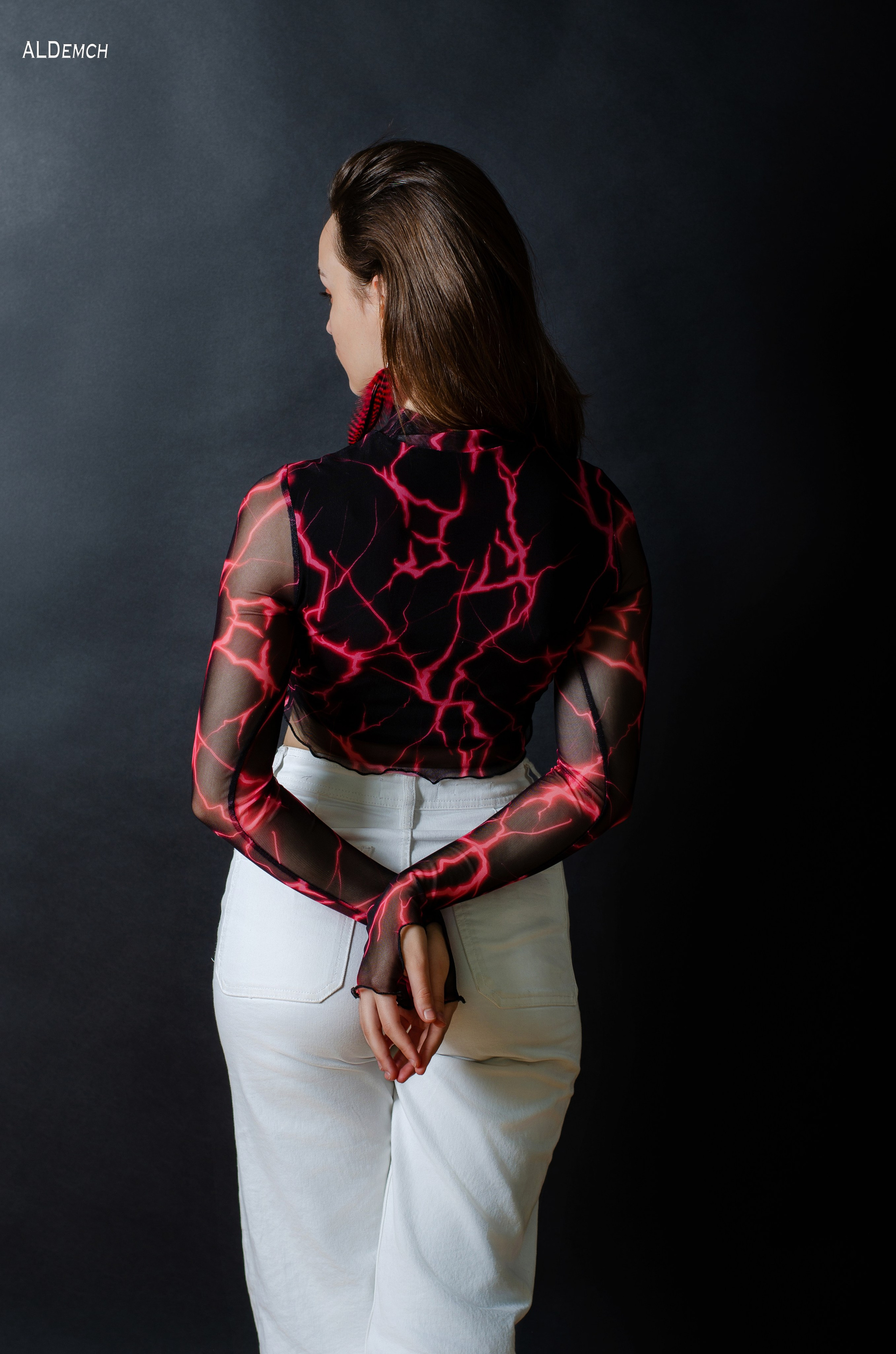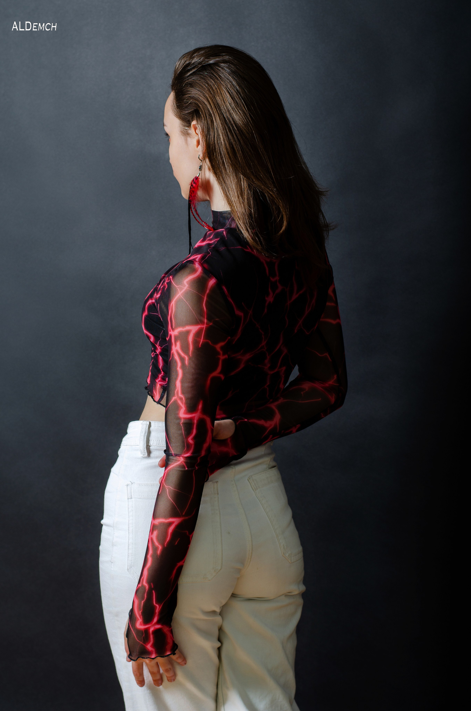 Белые джинсы и чёрный топик: дерзкий, современный, урбанистический. Этот дуэт создаёт контраст, добавляет кадру лёгкости и движения — отлично подходит для лукбуков, соцсетей или personal branding.